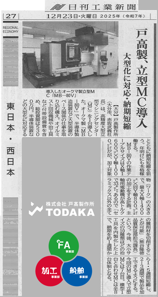 本日、高精度大型立型マシニングセンターの導入記事が掲載されました。
