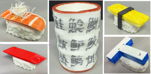 3Dプリンターで製作した湯飲みと寿司ネタとシャリ・・・と寿司ネタにされたT高くん。クオリティが高い。