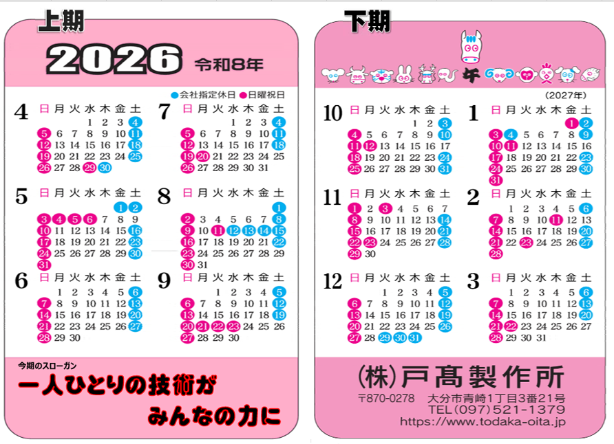 来期のカレンダーを掲載しましたので、お客様、お取引様よろしくお願い申し上げます。